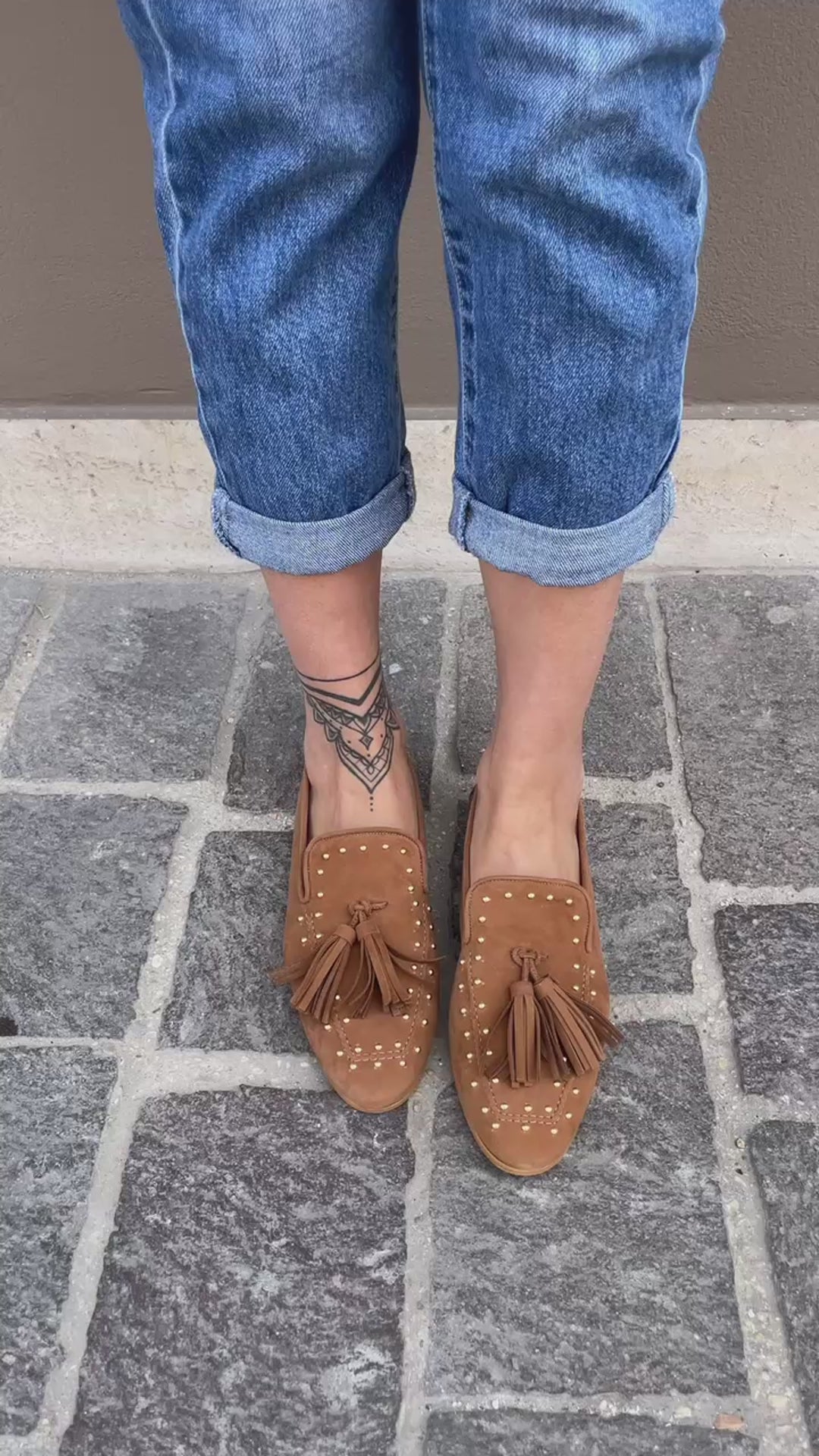 Patrasso The suede moccasin revisits a classic shoe in an elegant version. The versatile and timeless model is embellished with raised stitching on the upper and two matching studs, as well as being enriched by studs that frame the upper. The shoe is unlined and completed by the comfortable insole.